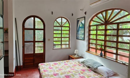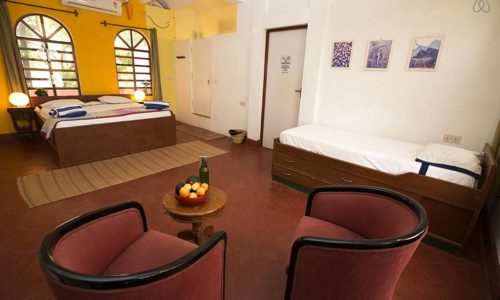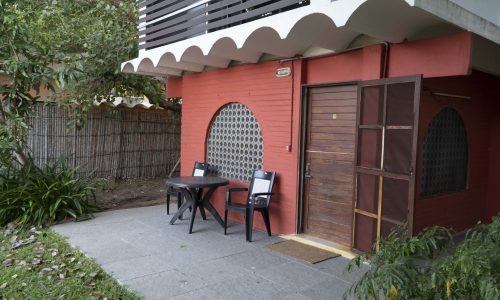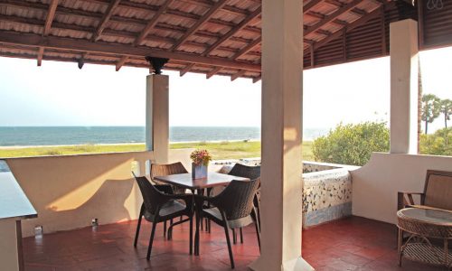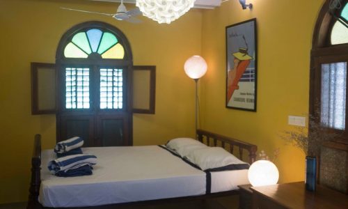 A Ground floor with two beds. It has a kitchenette, dining, and verandah. It’s barrier free and wheelchair accessible. Bang on the beach with swimming pool. Car parking is right in front of the house inside our Auroville guest house area.