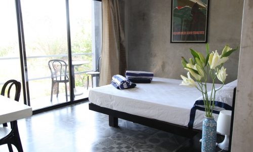 This is an upper floor AC room with a kitchenette (electric stove, fridge, dining table) and a small balcony that enjoys the breeze and view of the sea.